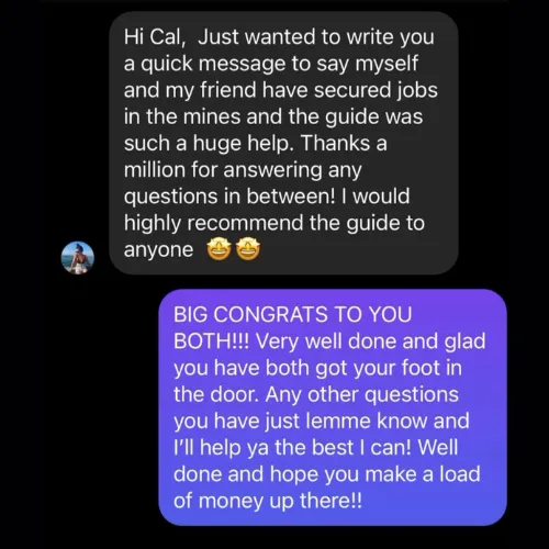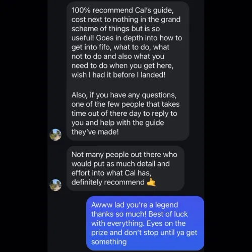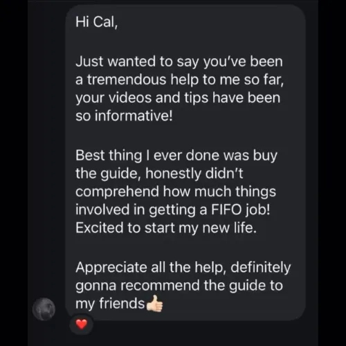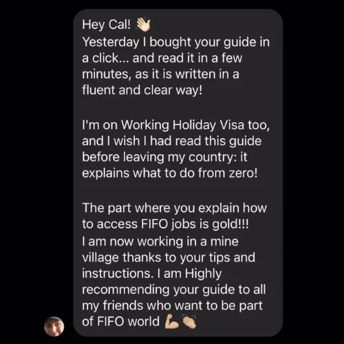 FIFO has a lot of pros and cons. I talk about this in my socials and go into more detail in my guide. Before you fully commit and start spending on flights and visas, you want to make sure you know what you’re getting yourself into. I’d recommend getting my step-by-step guide because I talk in depth about my journey. You will know more about what you're up against, what lies ahead of you and it will help you make a better-informed decision before you fully commit to the move. It’s helped many people already get FIFO jobs. It can also help you!
